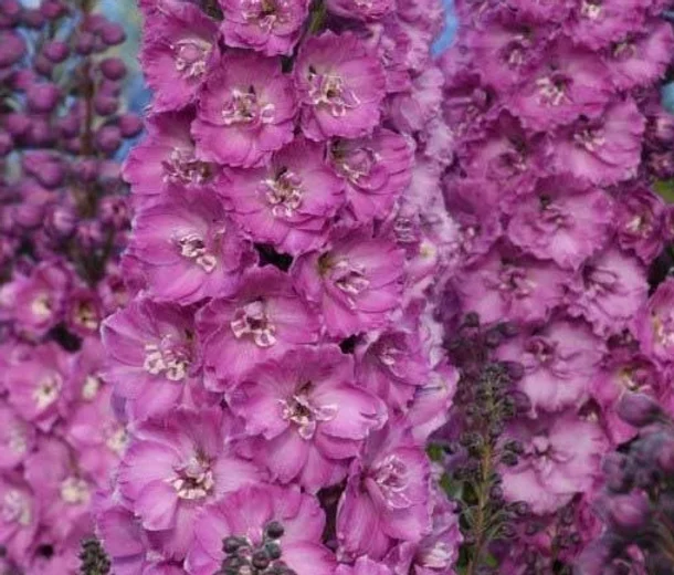 Рассада Дельфиниума высокого Делфиз Саффир (Delphi's Saffier) – привлекает садоводов не только импозантным внешним видом, но и простотой в уходе и быстрым ростом. Сорт неприхотливый и его не надо накрывать зимой. Цветение начинается в конце июня и в зависимости от погоды продолжается от 20 до 30 дней. Часто цветок применяется для создания букетов, которые не начинают увядать на протяжении 10 дней. Цветы ярко-лиловые махровой текстуры до 4 – 5 см в диаметре и составляют конусовидные соцветия длиной до 70 см. Листья округлой формы. Выращивать растение рекомендуется на нейтральных почвах с хорошим дренированием.