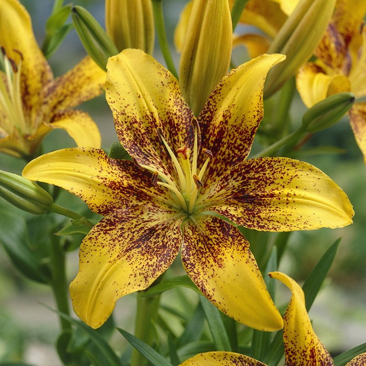 Луковицы Лилии азиатской Танго Голден Стоун (Lilium asiatic Tango Golden Stone) ценятся и фанатами лилий, и остальными цветоводами за характерную для группы «танго» контрастную расцветку. Данный сорт отличается крупными лимонно-желтыми соцветиями, лепестки которых покрывает густой вишнево-красный крап.