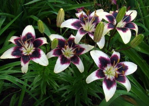 Луковицы лилии Пурпл Харт (Purple Heart) порадуют цветами необычной окраски – белоснежные лепестки украшены темно-бордовыми пятнами и такой же каймой. Высота взрослых кустов достигает примерно 80 сантиметров. Цветение начинается в июне-июле и длится до конца лета, в это время воздух будет наполнен приятным цветочным ароматом. Луковицы лилии Purple Heart можно высаживать на бордюрах, рабатках, использовать для наполнения цветников. Этот сорт часто выращивают для срезки составления букетов. Растение отлично смотрится в группах, а также гармонично сочетается с цветами других окрасок.