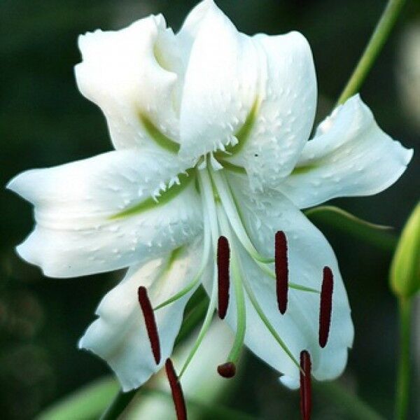 Саженцы и рассада лилии видовой Прекрасная Альбум (Lilium) с цветами чисто-белого цвета без вкраплений. Изгибы цветка оттеняет светло-зеленая полоса внутри лепестка и темные тычинки. Настоящая прекрасная королева сада завораживает изысканностью и благородностью. Благоухание можно почувствовать, еще не войдя в сад. Срезанные цветы способны сохранять этот аромат около 10 дней.