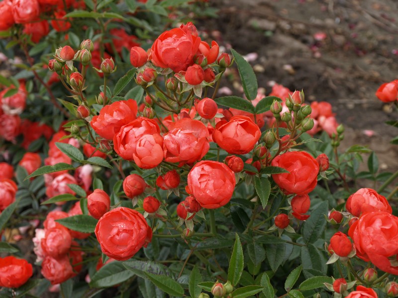 Саженцы розы полиантовой Оранж морсдаг (Rosa Orange Morsdag) отличаются необычной формой цветков – лепестки полностью не распускаются, а образуют шарообразные пушистые розетки. Высота взрослого почвопокровного куста – 45-55 сантиметров, ширина – около 80 сантиметров. Листочки небольшие, оливково-зеленые. На одном стебле завязывается не менее 5-10 махровых цветочков диаметром 4-6 сантиметров, окрашенных в оранжево-красный цвет. Куст подлежит декоративному формированию. Растение хорошо развивается на солнечных участках и в полутени. Предпочтение следует отдавать рыхлым, плодородным почвам.