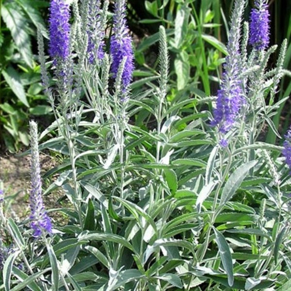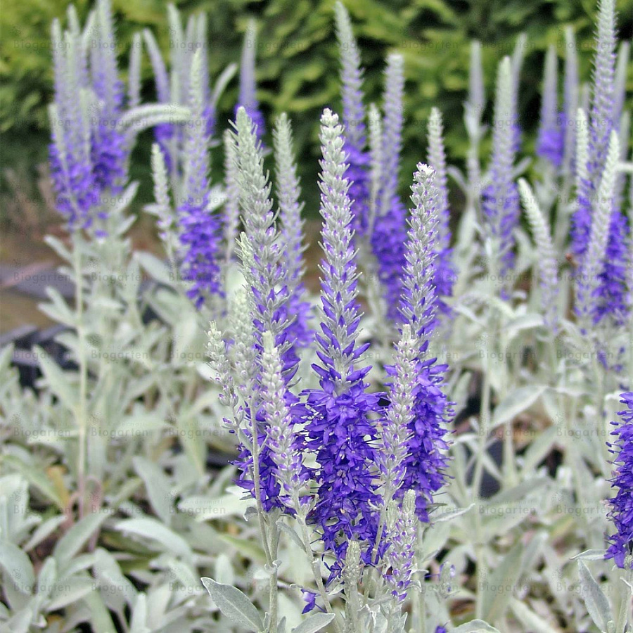 Рассада вероники Седая (Incana) имеет небольшие листики, которые расположены на войлочно-опушенных крепких стеблях. В середине июня появляются темно-синие цветы, которые представляют собой колосовидную форму. Цветение радует приблизительно около 40 дней. В высоту растет 25-35 см. Достоинства растения: